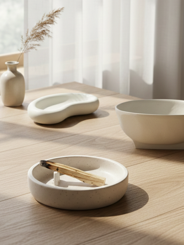 El palo santo es conocido por sus propiedades purificadoras y calmantes. En combinación con este cuenco, se crea un momento de relajación que combina perfectamente con interiores de materiales naturales y tonos suaves. Su forma orgánica aporta un carácter alegre pero armonioso, mientras que el estilo Japandi garantiza una estética serena y minimalista.