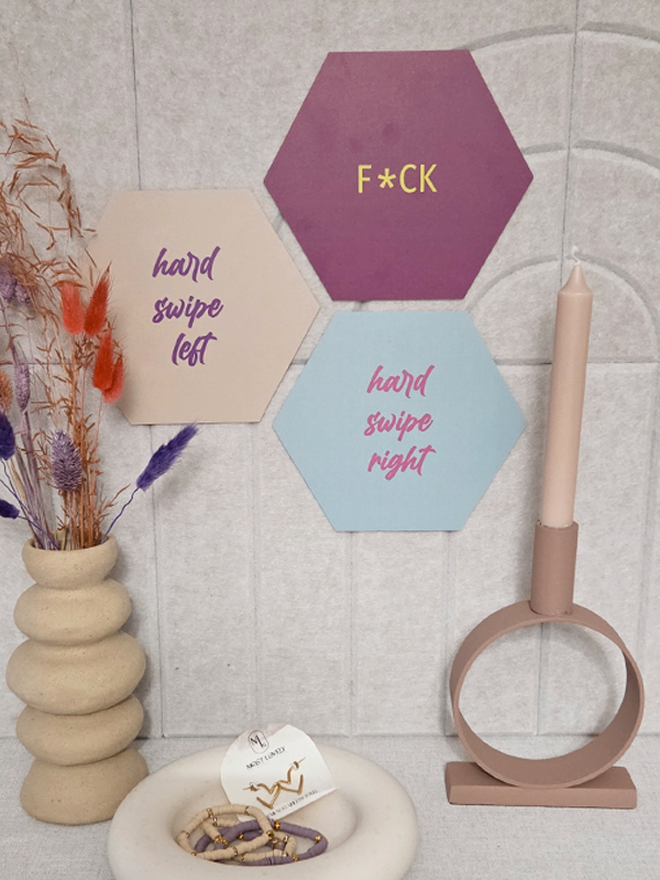 La palabra ‘F*ck’ es directa y potente, una expresión divertida y liberadora para quienes aprecian un toque desenfadado en sus regalos. Combina este hexágono con otros pasos de la colección Just4You para un regalo único y personal.